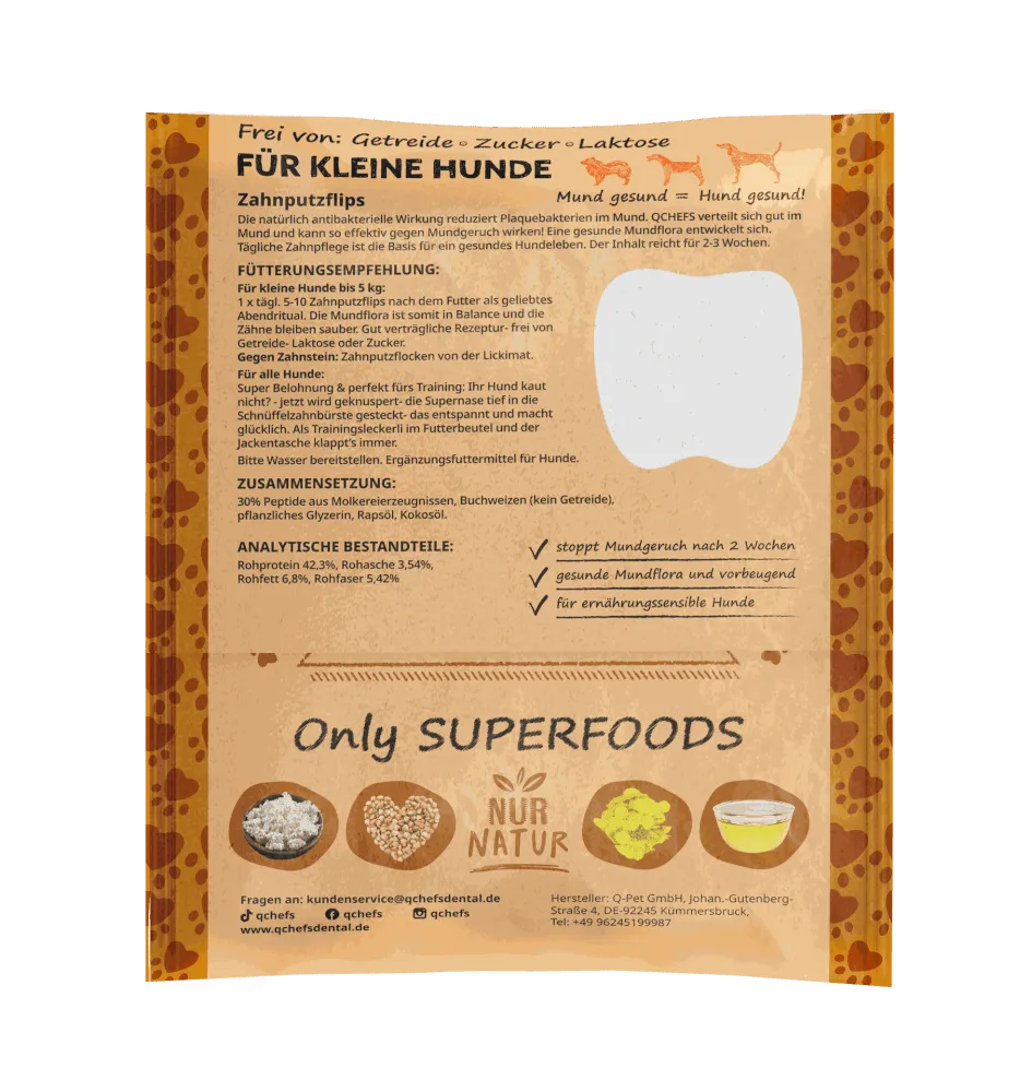 Les produits QCHEFS se dissolvent dans la bouche avec la salive – se répartissent dans la cavité buccale via la salive – atteignent toutes les surfaces et passent entre les dents. La mauvaise haleine et l’inflammation sont réduites et le tartre se dissout. La flore buccale est rééquilibrée.